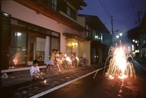 ぎおんの由来は、水窪町では昔から山吹屋根の家が多く火災防止のため、花火をできる日を限定したのが定説となっていますが、他説では昔、京都から天皇のお孫にあたるお方が水窪にお住まいになられた時、京都を懐かしんで花火をやったことが始まりとも言われています。始まりは、はっきりわかりませんが、町中に風習がただよういい雰囲気になります。