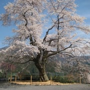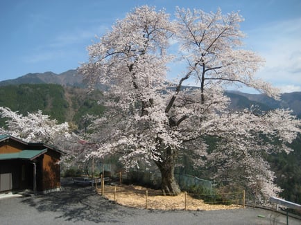 標高約650メートル、水窪町大野地区の旧水窪小学校大野分校に春を告げるヤマ桜の木として、小さな集落を華やかに彩り咲き誇ります。