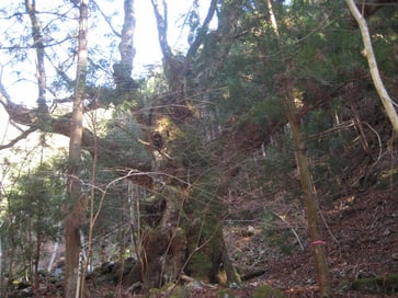 この木の付近はかつて山伏が通ったとされる「行者道」があり、沢のほとりに立っています。